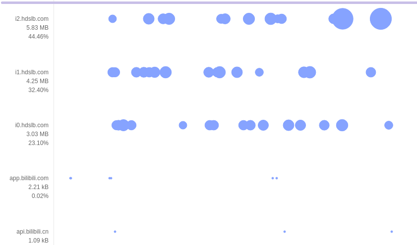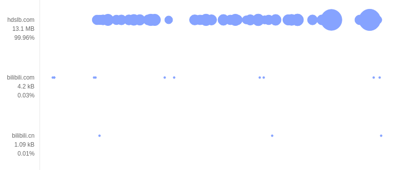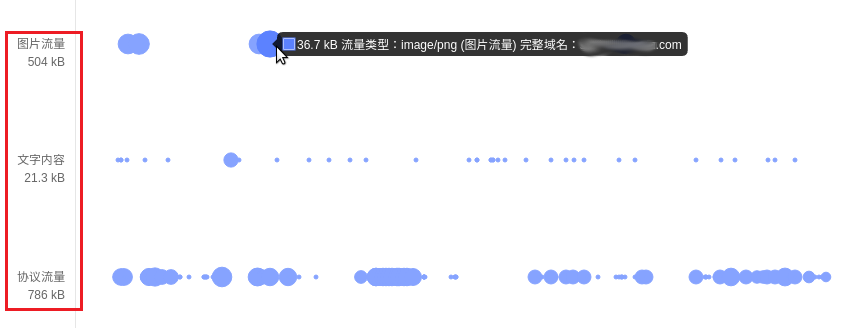点击进入流量分析界面,横轴是时间,纵向是分类标准,一个点代表一个 http 请求,大的代表流量大,支持左右拖拽以及滑轮缩放,上方有六种分类标准辅助流量分析
