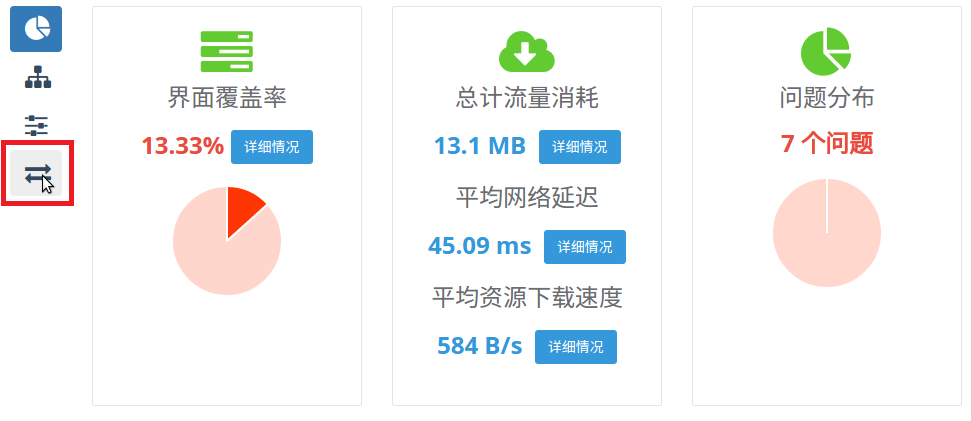 这是一个 Appetizer 测试报告的截图,这里看到的是统计信息,左边四个功能项目分别是:统计信息,业务流程建模,详细时间轴图,流量分析;所以请戳第四个