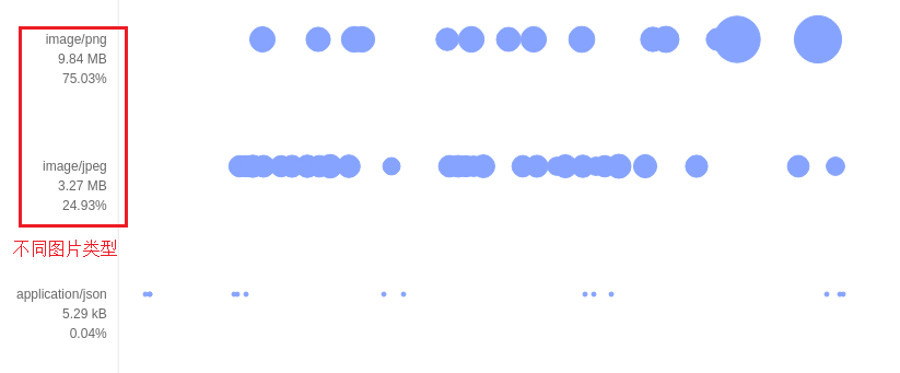Appetizer 将网络请求,按照获取数据类型划分为图片、文本、协议和其他请求,实际 APP 使用最广泛的三类。以上图为例,总体来说,APP 网络请求以协议流量和图片流量为主,协议流量多而密集,图片流量少而大,自然优先优化协议请求和图片。